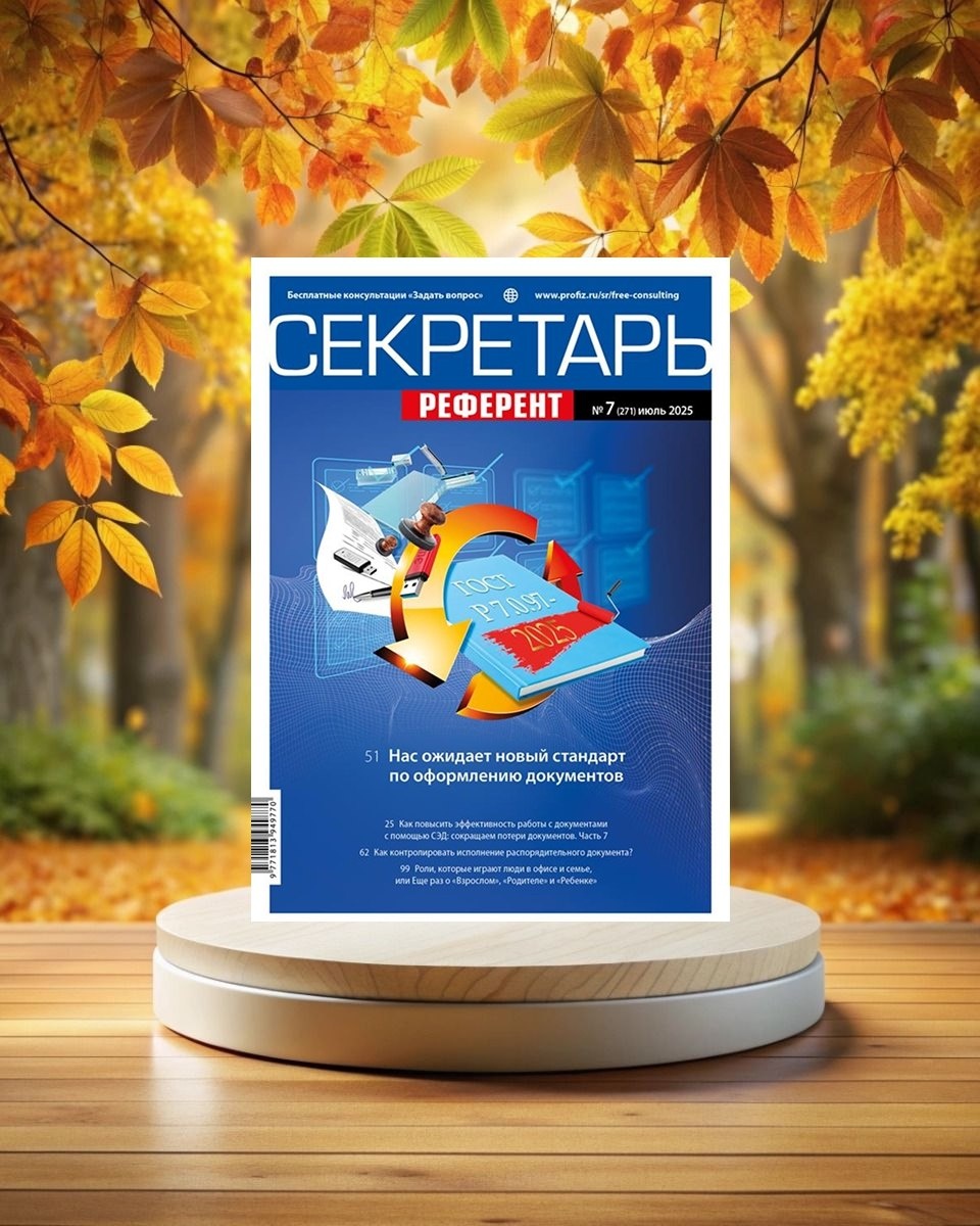 Дарим номер журнала «Секретарь-референт»! Читайте в бесплатном номере журнала: • новый ГОСТ Р 7.0.97-2025 по оформлению документов: какие изменения и дополнения внесены; • как контролировать исполнение распорядительных документов; • как сократить потери документов в СЭД; • как передать документы на хранение в случае ликвидации организации; • как по инициативе работодателя ввести режим неполного рабочего времени; • каковы функции работника, отвечающего за контроль исполнения документов и поручений; • и многое другое. Получить бесплатный номер