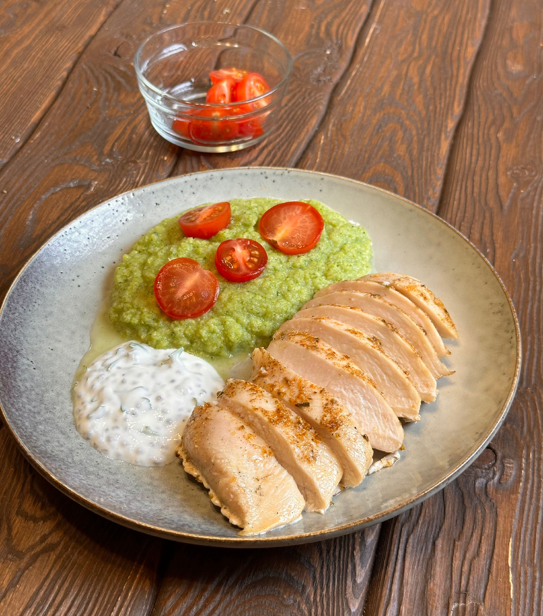 Если вам хочется приготовить что-то лёгкое, но сытное, этот рецепт просто находка. Нежное куриное филе, воздушное пюре из брокколи и освежающий соус из йогурта с семенами чиа - это именно тот вариант, когда здоровая еда получается ресторанной на вкус. И всё без сливок, майонеза или лишнего масла. Шаг 1. Семена чиа залейте 100 мл воды и оставьте на 5 минут. Затем лишнюю воду слейте. Шаг 2. Для сочности куриное филе замочите в рассоле (2 ч. л. соли на стакан воды) на 2–3 часа. После достаньте, обсушите бумажным полотенцем. Шаг 3. Разогрейте духовку до 180 °C. Смешайте оливковое масло и специи, обмажьте курицу. Выложите на противень с пергаментом и запекайте около 20 минут. Шаг 4. Брокколи отварите в подсоленной воде 5 минут, затем откиньте на дуршлаг. Часть воды (около 70 мл) сохраните - она понадобится для пюре. Шаг 5. В блендере пробейте брокколи с кунжутным маслом и водой от варки до состояния пюре. Шаг 6. Для соуса смешайте семена чиа, йогурт, мелко нарубленную петрушку и щепотку со