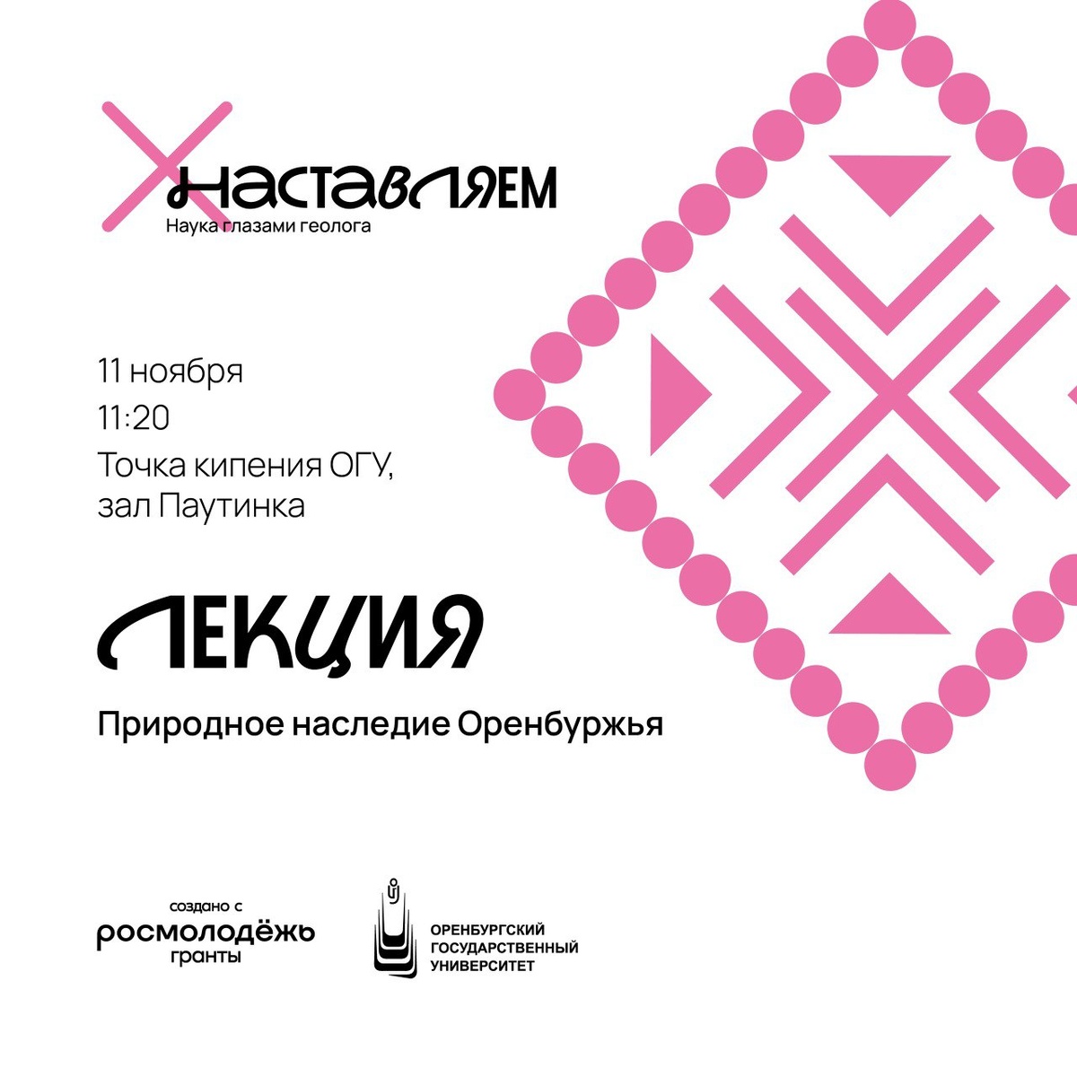 Прекрасное рядом 🌱 Уже 11 ноября в 11.20 в «Точке кипения» ОГУ состоится новая встреча из серии научно-популярных лекций, которые проходят в рамках проекта «Наставляем: наука глазами геолога». Эксперт Русского географического общества, доцент кафедры геологии, географии и кадастра Института наук о Земле Евгений Семенов проведет увлекательную лекцию «Природное наследие Оренбуржья». Приходи, если хочешь узнать больше о редких видах растений и животных, встречающихся только в нашем регионе, уникальных геологических памятниках и ландшафтах ☀️ 📌 Проект реализуется при грантовой поддержке Федерального агентства по делам молодежи (Росмолодежь). #ОГУ #в_ОГУ #OSU #Росмолодёжь #РосмолодёжьГранты