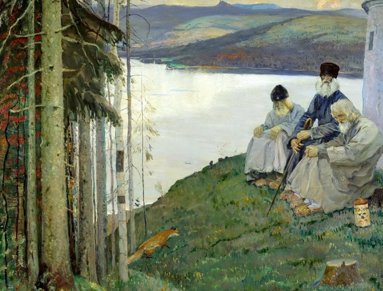 «Святую Русь» Нестеров писал шесть лет: с момента возвращения к станковой живописи после долгой работы над росписями храмов. За вдохновением и образами героев он отправился в Соловецкий монастырь на Белом море, с его суровой природой и будто замершим старинным укладом жизни.