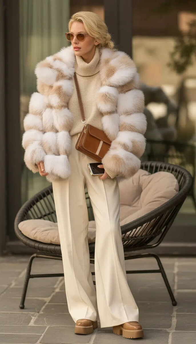 Другие тянутся к объемным "объятиям": пушистый кокон, накинутый поверх многослойного комплекта, помогает создать раслабленный образ.