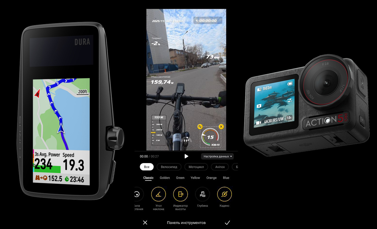 Велогараж. Ч.6. Наложение телеметрии с велокомпьютера Coros Dura на видео с камеры DJI Osmo Action 5 Pro в мобильном приложении DJI Mimo.