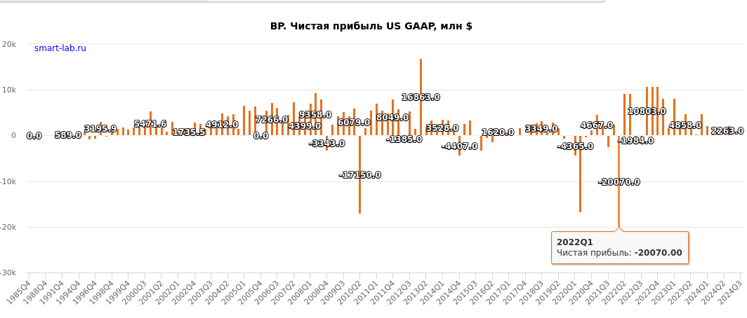 Долгосрочно в прибыли Лукойл потеряет не так много от потери активов. Но в свежем отчёте цифры могут быть страшными (если Лукойл не договорится). Сейчас есть актив. Он стоит много миллиардов. И вот Лукойл актив теряет, вместо старых больших цифр в отчетности появится 0. Разница пойдёт в убыток. Напомню как это бывает: Британская нефтегазовая компания BP по итогам первого квартала 2022 года получила $20 млрд чистого убытка. Убыток компании в результате списания активов из-за выхода из «Роснефти» и рыночного влияния на российские активы после начала специальной военной операции на Украине составляет $24,033 млрд Оцените масштаб столбика на графике: Интересно, как отреагируют акции на нашем тонком рынке, когда инвесторы увидят что-то подобное в отчётности? А если списаний будет много? Вот из свежего: Reuters: Ирак прекращает платежи «Лукойлу».Компания объявляет о реализации форс-мажора на иракском месторождении Курна-2 В общем, мне интересно чем всё закончится. И очень хочу отчёт посмотре