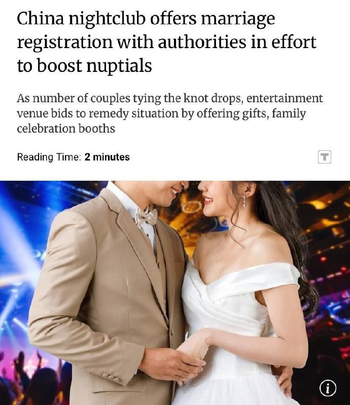 Китай сталкивается с резким снижением рождаемости, поэтому правительство приняло решение разрешить заключение браков прямо в ночных клубах с целью улучшения демографической ситуации. Это нововведение распространяется не только на клубы, но и на другие места — метро, парки, храмы, фестивали и многие другие. Власти надеются, что такие меры подтолкнут молодежь к созданию семей и рождению детей. Дополнительно молодоженам предлагают различные подарки — пригласительные на фестивали, наборы посуды, денежные подарки, сертификаты и другие сюрпризы. Эта инициатива действительно начала приносить результаты: в третьем квартале этого года количество заключенных браков возросло на 22% по сравнению с прошлым годом. Читать подробнее на Reuters Постмейкер - автоматическое ведение канала 🤖 Анимация | СhatGPT-4 | Помощь с резюме