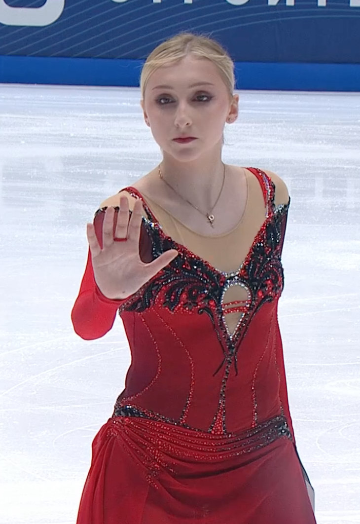 Софья Муравьева проводит первый крупный старт под руководством Алексея Николаевича Мишина. Безусловно до этого был и Кубок Санкт-Петербурга, но этап Гран-при это всероссийские соревнования, более масштабное мероприятие, поэтому это более важный старт. И главный дебют Софьи в штабе Профессора. Первое конечно же, что бросается в глаза - новые платья Софьи и в короткой и в произвольной программе. Еще когда спортсменка выступала на контрольных прокатах сборной России, то после ее выхода на лед в КП полились комментарии о том, что платье совершенно не подходит Софье, совершенно портит ее фигуру, в частности и так широкие плечи делает еще больше. Давайте вспомним предыдущий наряд Софьи: А теперь новая версия: Честно говоря, ни предыдущий, ни текущий вариант мне не нравится. Первый вариант смотрится не ахти не только из-за плеч, но и из-за посадки на груди. Очевидно же, что декольте должно как бы обрамлять, а по факту получается, что оно не подчеркивает красивые изгибы, а болтается где-то в