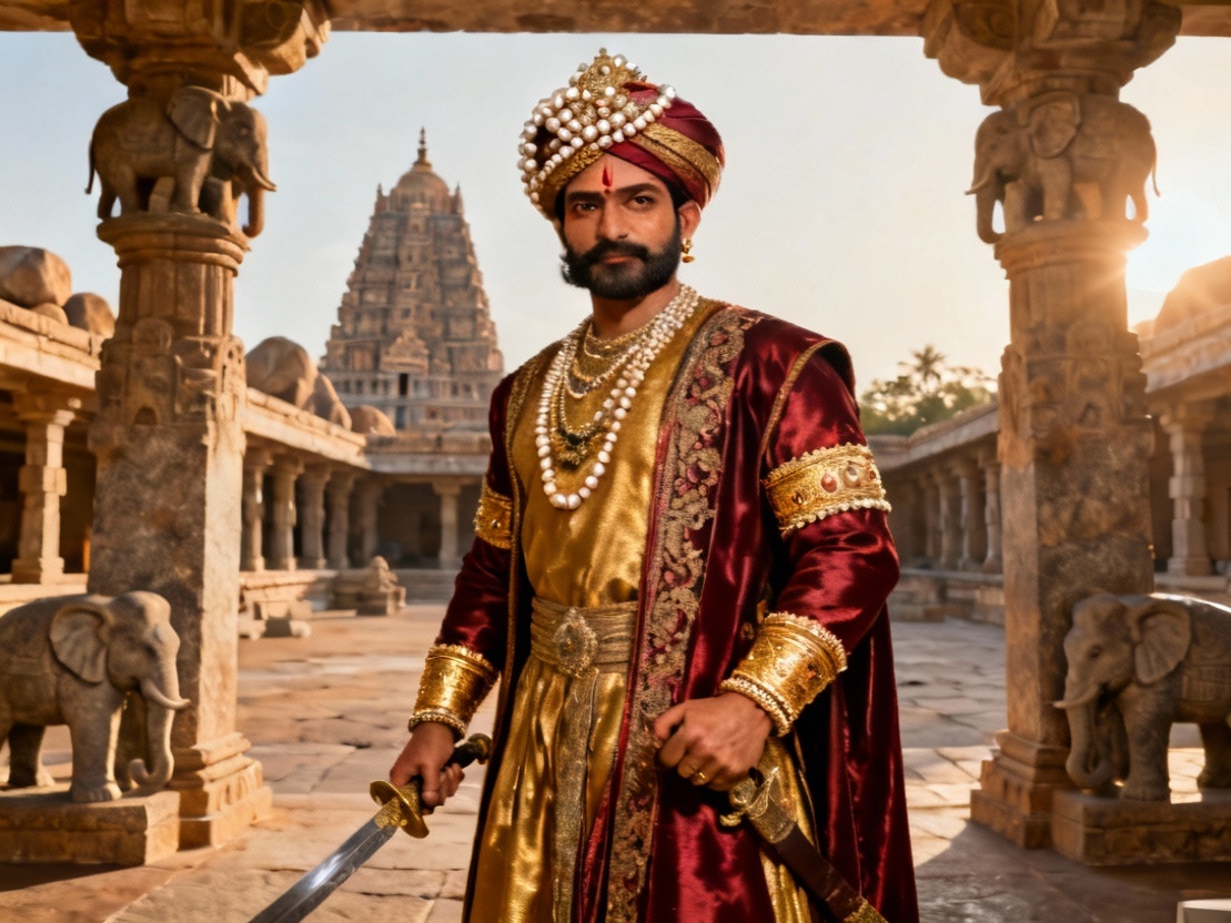 “Цветок для царицы” В дни, когда Хампи сиял, как небесный город Индры, а река Тунгабхадра несла свои воды между каменными холмами, жил великий повелитель — Шри Кришнадеварая, опора мира и свет династии Тулува. Рядом с ним, подобно мягкому лунному свету рядом с солнцем, жила его царица — Тирумала Деви, чистая сердцем, мудрая, как Веда, и прекрасная, как рассвет над Виттхала-мандиром. 🌾 Говорят, когда царь уходил в поход, она стояла на террасе дворца и молилась Венкатешваре, держа в руках венок из жасмина. А когда он возвращался — покрытый пылью сражений, но с сияющими глазами — она встречала его не короной, не почестями, а чашей воды и улыбкой, тихо говоря: “Ты снова принес свет в дом наш, мой господин.” И тогда Кришнадеварая клал к её ногам меч, как к алтарю, и отвечал: “Не я победил — молитва твоя победила.” 🌺 Однажды, во время весеннего праздника, царь увидел в пруду у храма одинокий лотос, распустившийся среди воды. Он сошёл с коня, снял перчатки, и, не позвав слуг, сам вошёл в в
