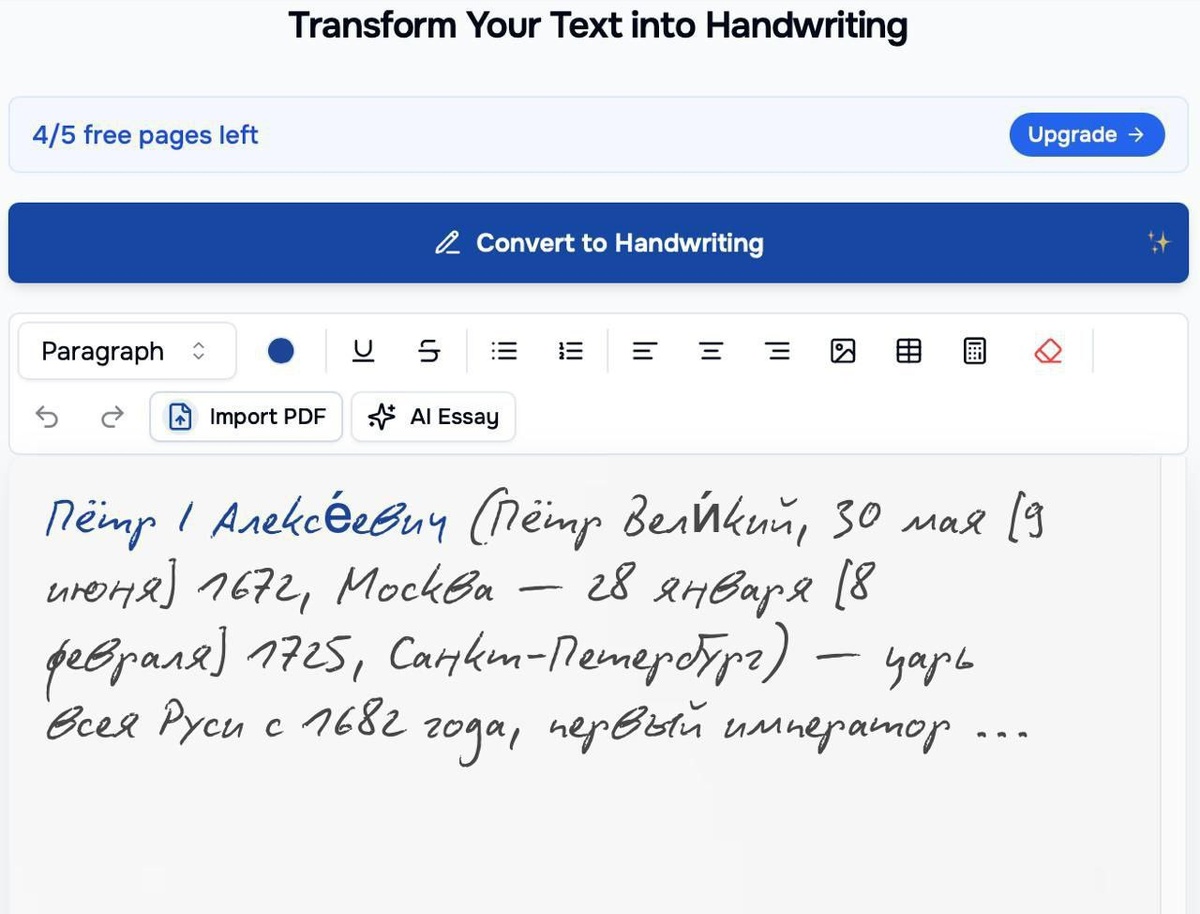 ПСС... ТУТ РУКОПИСИ С ИИ🤫✍️ Забудь про судорожное переписывание 20-страничного реферата от руки в 3 часа ночи 🌙, Появилась HandText AI — нейронка, которая берёт твой скучный Word-файл и превращает его в живую рукопись, будто ты сам(а) сидел(а) и аккуратно выводил(а) каждую букву, мечтая о выходных 📝✨. Тут реальный, читаемый, человеческий почерк — без кривых «ы», без «почеркушка робота под кайфом», без «ой, это текст или ЭКГ?» ❤️🔥 Как это работает? 1️⃣ Заходишь на сайт — никаких регистраций, только чистая магия. 2️⃣ Выбираешь стиль почерка — от «аккуратный ботаник» 🤓 до «похмельный поэт с дипломом» 🍷📜. 3️⃣ Копипастишь свой курсач, диплом, эссе про Пикассо или даже любовное письмо бывшему (ну, вдруг?) ❤️🩹 4️⃣ Жмёшь «Создать» — и через 0.5 секунды у тебя готов PDF, который выглядит так, будто ты действительно потратил(а) на это вечность 🕰. Всё бесплатно. Без подписки. Без «поделись в сторис, чтобы разблокировать “курсив”» 🙄. Просто зашёл, напечатал — и ушёл герой(иней) 🦸♂️