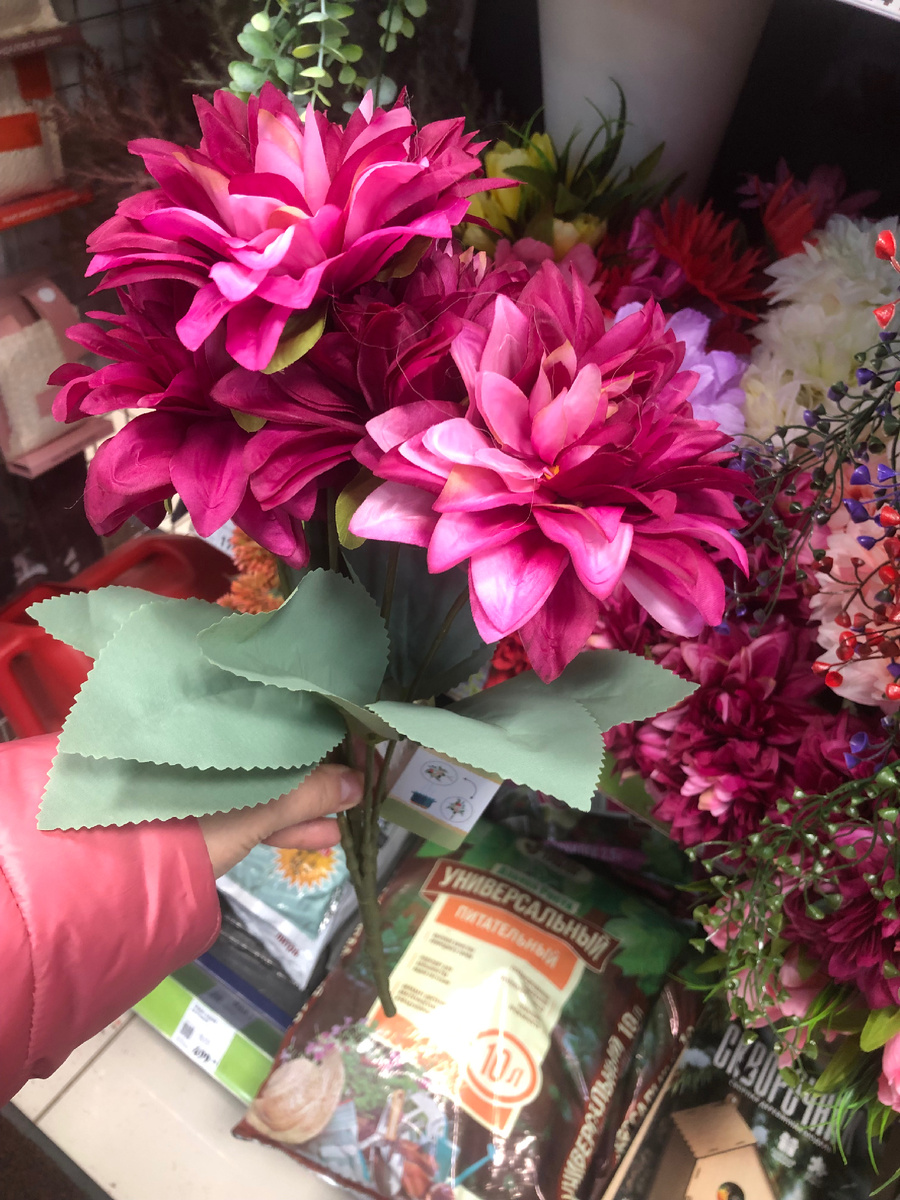 Цветочный стеллаж пополнился новыми искусственными цветами. Это георгин, точнее ветка с кесколькими пышными бутонами. Вглядит очень красиво!