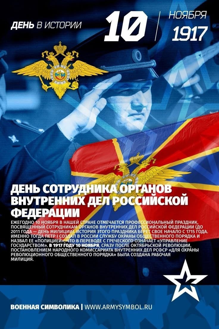 👮♂ 10 ноября - День сотрудника органов внутренних дел РФ День советской милиции в СССР 📆 Рубрика "Странички истории" ▪ День сотрудника органов внутренних дел Российской Федерации (до 2011 года — День милиции) — профессиональный праздник сотрудников Министерства внутренних дел Российской Федерации (до 1991 года — МВД СССР). Отмечается ежегодно 10 ноября. Дата выбрана в связи с тем, что именно в этот день в 1917 году было подписано постановление «О рабочей милиции». Из истории праздника ▪ История праздника берёт начало в Российской империи. В 1715 году император Пётр I создал в России службу охраны общественного порядка, которую назвал полицией. ▪ В 1718 году по указу Петра I в Петербурге появилась новая государственная должность — генерал-полицмейстер. Он возглавил службу охраны общественного порядка, которая занималась обеспечением безопасности граждан и поимкой преступников. ▪ В 1778 году был подготовлен Всероссийский полицейский устав, а в 1802 году император Александр I учред
