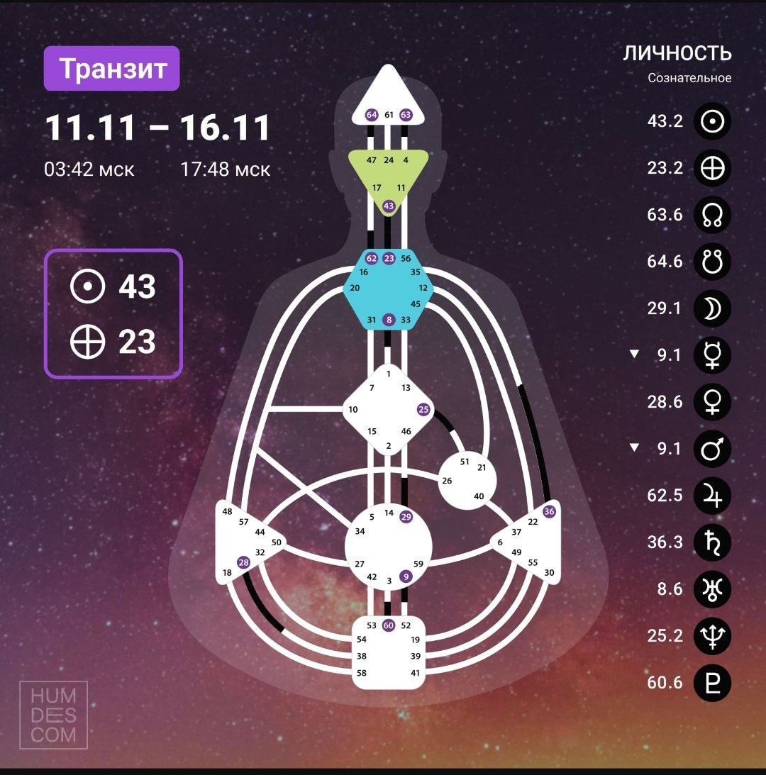 🪐 Планетарные Транзиты ▶️ с 11 ноября (03:42 мск) ⏹️ по 16 ноября (17:48 мск) Солнце в 43 Воротах Прозрения Земля в 23 Воротах Ассимиляции Этот транзит характеризуется подъёмом творческой энергии, инсайтами, подходит для изучения своего тела и души. Если вы таких радужных эмоций не испытываете, вероятно, вам не хватает приятных физических нагрузок или креатива, где вы можете выразить или даже станцевать (почему бы и да) всё, что наболело. Словом, сейчас самое время проживать любые свои состояния и выражать их либо в творчестве, либо в кругу единомышленников. Ещё этот период прекрасно подходит для избавления от устаревших идей, привычек и отношений. Узнавайте вещи на глубинном уровне, прощайтесь с ненужным без сожалений, ставьте цель и действуйте по плану. Ваша индивидуальность станет ключом к новым возможностям и событиям — не пропустите их. 💡 Помогают: Адаптация к переменам, смелость, творчество, отстаивание своей индивидуальности, лёгкое отношение к вещам. ⚠️ Мешают: Неумение