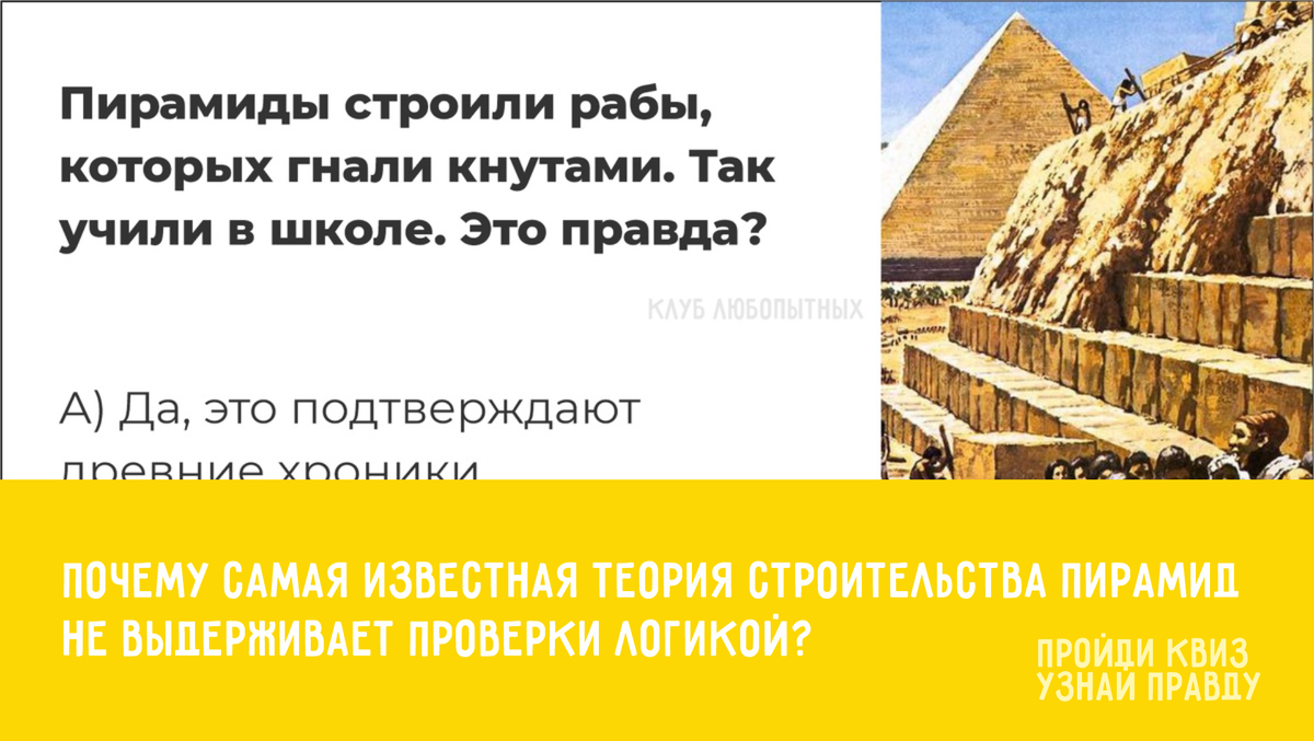 Рабы? Инопланетяне? Или… свободные люди? Проверь свои знания — и, возможно, всё, во что ты верил, рухнет, как песчаная башня. ❓ Вопрос 1 ❓ Вопрос 2 ❓ Вопрос 3 Теперь ты знаешь: пирамиды строили не рабы, не пришельцы…