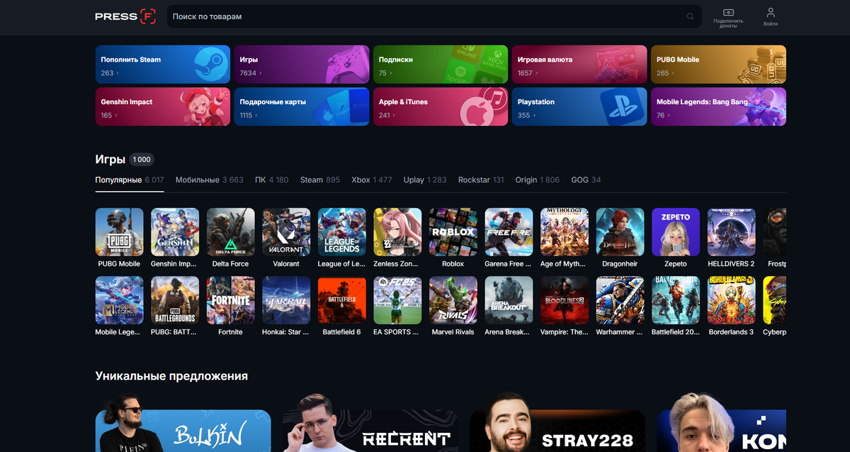 Press F позиционируется как мультикатегорийный маркетплейс цифровых товаров для геймеров. Платформа выступает посредником между продавцами и покупателями, обеспечивая безопасные сделки и удобный интерфейс. Press F сотрудничает со стримерами, предоставляя им инструменты для монетизации контента и расширения аудитории. Платформа предлагает стримерам возможность создавать собственные магазины цифровых товаров, получать процент с продаж и использовать различные функции для взаимодействия с аудиторией. На сайте Press F упоминаются такие стримеры, как Recrent, Stray228, Nix, Shadowkek, HARD PLAY, Кома и ELLVI, которые уже используют платформу для монетизации. Сервис позволяет подключить донаты с уведомлениями: зрители могут отправлять донаты, а стример настраивает оповещения (гифки, звуки). В личном кабинете доступна детальная статистика. Таким образом, Press F предоставляет стримерам комплексные инструменты для монетизации, сочетая простоту использования с гибкими моделями заработка.