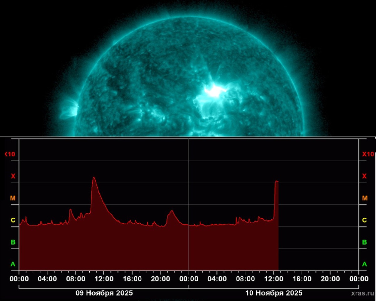 В ИЗМИРАНе сообщили о риске развития на Земле сильной магнитной бури 11-12 ноября. Напомним, что Солнце выбросило сразу две вспышки наивысшего X-уровня (фото взято с ТГ https://t.me/lpixras) X1.21, произошедшая 10 ноября, была родом из той же самой области, что и предыдущая, 9 ноября (X1.79). Мы зарегистрировали рост потока протонов с энергиями более 10 МэВ (мегаэлектронвольт), до уровня 20 PFU (с 10 PFU начинается условно опасный уровень, грозящий проблемами, например, спутниковой электронике), – прокомментировала руководитель Центра прогнозов космической погоды Мария Абунина. — Геомагнитное возмущение от вспышки может достигнуть отметки G3 (Кр7) или G4 (Кр8). Не исключено, что она может дойти и до наивысшего уровня G5 (Kp 9), но это пока маловероятно.