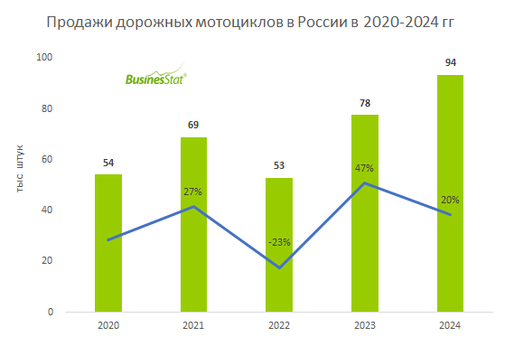 В 2020-2024 гг продажи дорожных мотоциклов в России увеличились в 1,7 раза: с 54 до 94 тыс штук.