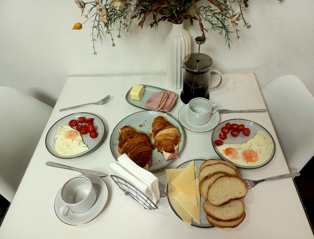 Кофе, яйца, помидорки и "конструктор бутербродов". Впереди насыщенный день и хороший завтрак не помешает.