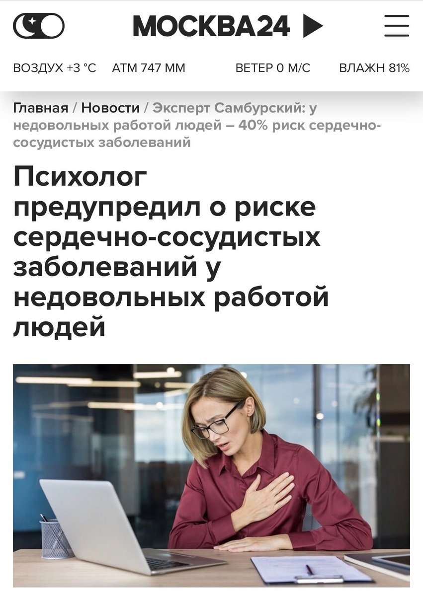 Если каждое утро начинается с « ну когда это кончится», а прийти на работу становится настоящим подвигом - возрастает риск сердечно-сосудистых заболеваний и вероятность развития депрессии. Рассказал для Москвы 24 как неудовлетворённость своей работой влияет на наше физическое состояние. https://www.m24.ru/news/obshchestvo/10112025/845627