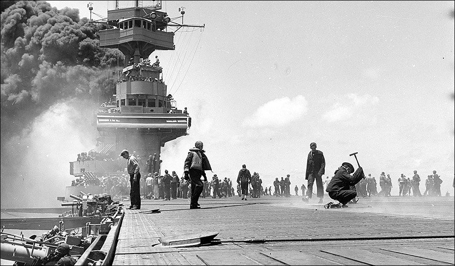 4 июня 1942 года американский авианосец "Йорктаун" вёл отчаянную борьбу за жизнь после попадания трёх японских авиабомб, поразивших жизненно важные центры корабля и вызвавшие массированные пожары