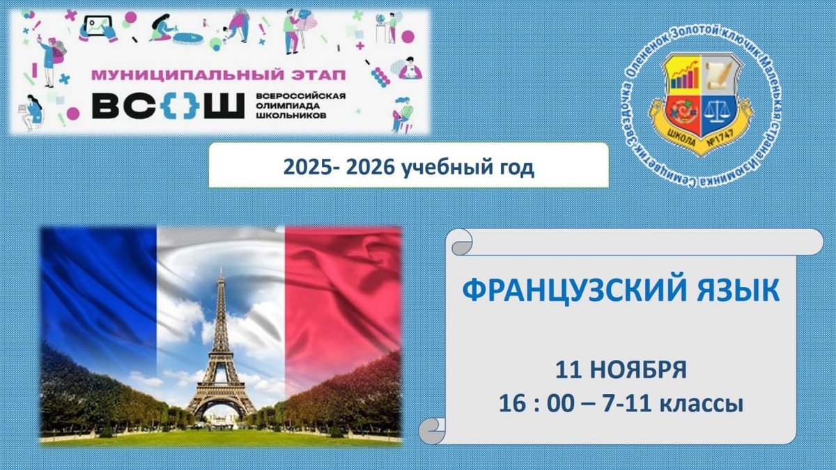 Дорогие ребята! 🤗 Опубликовано распределение участников на муниципальный этап всероссийской олимпиады школьников в Москве 2025/26 учебного года по французскому языку. Соревнование пройдет 11 ноября 2025 года. В этот день тур начнется в 16:00. На выполнение заданий 7-8 классов будет отведено 85 минут, 9-11 классов – 165 минут. Школьникам необходимо взять с собой на тур: - документ, подтверждающий личность* (социальную карту, паспорт, справку из школы с фотографией или другой документ с фотографией); - листок участника или логин ВсОШ из него – должны выдать в вашей школе; - наушники с длинным проводом для выполнения аудиозадания; - сменную обувь. Вся информация о муниципальном этапе собрана на странице. 💐Желаем удачи! #ДОНМ #ШколыКолледжиМосквы #Школа1747