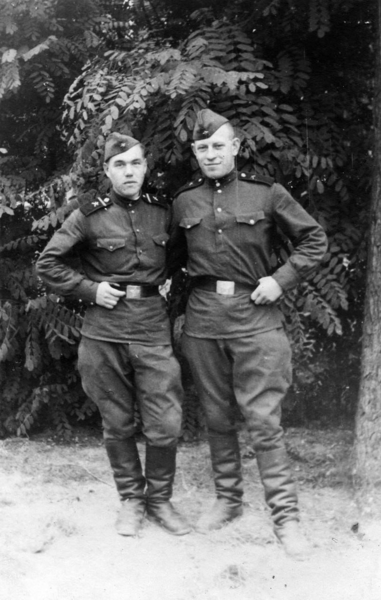 Ефрейтор и рядовой артиллерии в гимнастерках с повседневными погонами обр. 1943 года. До 1956 года эмблемы располагались в нижней части погона. Источник: отсканированная фотография из личной коллекции. #фото #артиллерия #Советская_армия