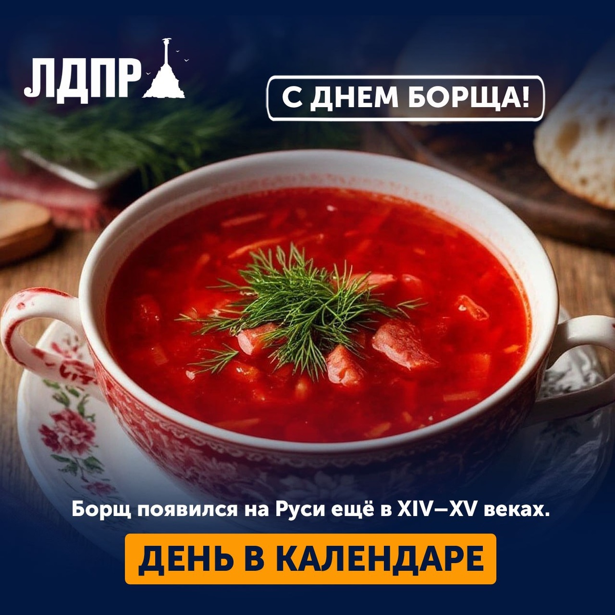 🥣 День борща — праздник, который объединяет! 🇷🇺 Сегодня отмечается Международный день борща — одного из самых узнаваемых и любимых блюд славянской кухни. Севастопольское отделение ЛДПР поздравляет всех, кто не представляет семейный обед без ароматной тарелки борща! 🍅 Борщ появился на Руси ещё в XIV–XV веках. По одной из версий, своё название он получил от растения борщевик, из которого первоначально готовили похлебку. Позже в состав вошла свёкла, и блюдо стало таким, каким мы знаем его сегодня — насыщенным, красным и с неповторимым ароматом. 🥬 Традиции варки борща передавались из поколения в поколение. В каждом регионе — свои секреты: где-то добавляют фасоль или сало, где-то — чесночные пампушки, а где-то варят постный вариант на грибном отваре. 🔥 Интересный факт: в 2022 году борщ был внесён в список нематериального культурного наследия ЮНЕСКО как символ кулинарной идентичности восточнославянских народов. 🍽 Для ЛДПР важно сохранять традиции, объединяющие людей. Ведь борщ —
