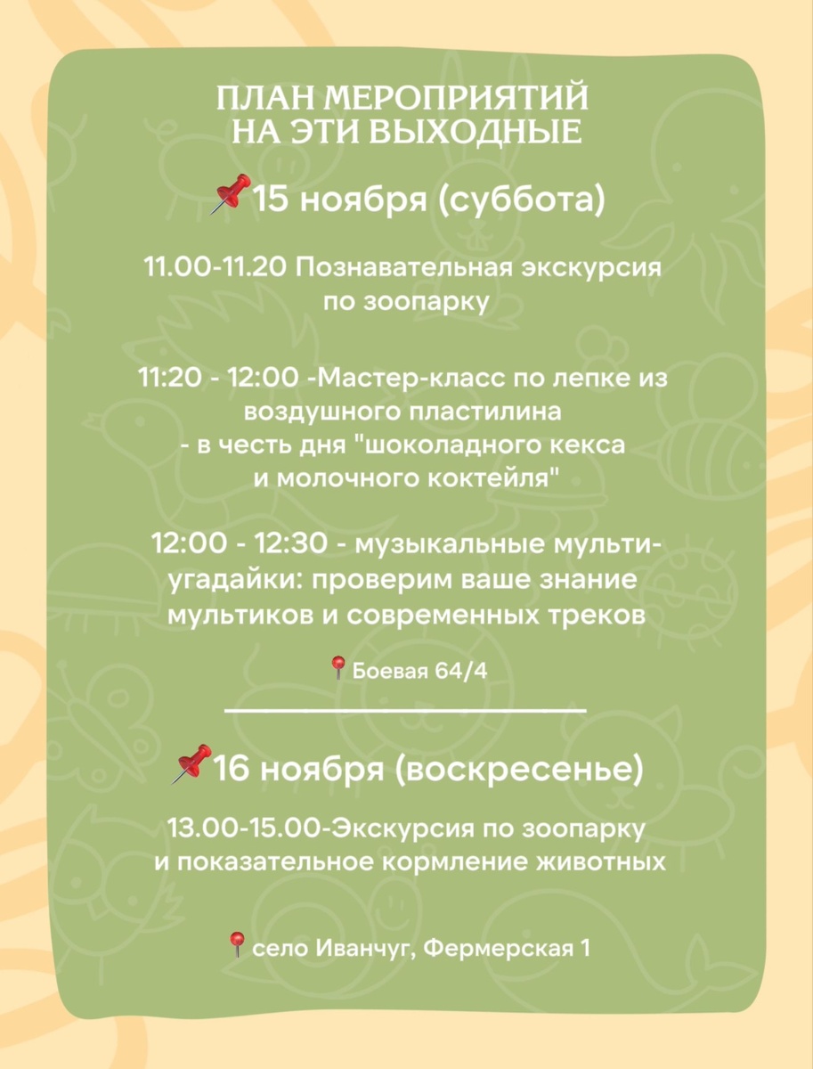 🦊🍁План мероприятий на выходные в зоопарке «Баба Фрося»! 🍁🐻 Суббота, 15.11: Познавательный день - изучаем животных и узнаём о них много нового! 📌11:00 - 11:20 - Познавательная экскурсия по зоопарку; 📌11:20 - 12:00- Мастер-класс по лепке из воздушного пластилина - в честь дня "шоколадного кекса и молочного коктейля" 📌 12:00 - 12:30 - музыкальные мульти-угадайки: проверим ваше знание мультиков и современных треков 📍Боевая 64/4 🕒Начало 11.00 Воскресенье, 16.11: Увлекательная экскурсия для вас и ваших детей. 📌Показательное кормление хищников и обзорная экскурсия по зоопарку 📍с. Иванчуг, Фермерская 1 🕓 Начало 13.00 📅 Ждем вас всей семьей! 📍 Где: зоопарк «Баба Фрося» 🔖 Мероприятия входят в стоимость билета