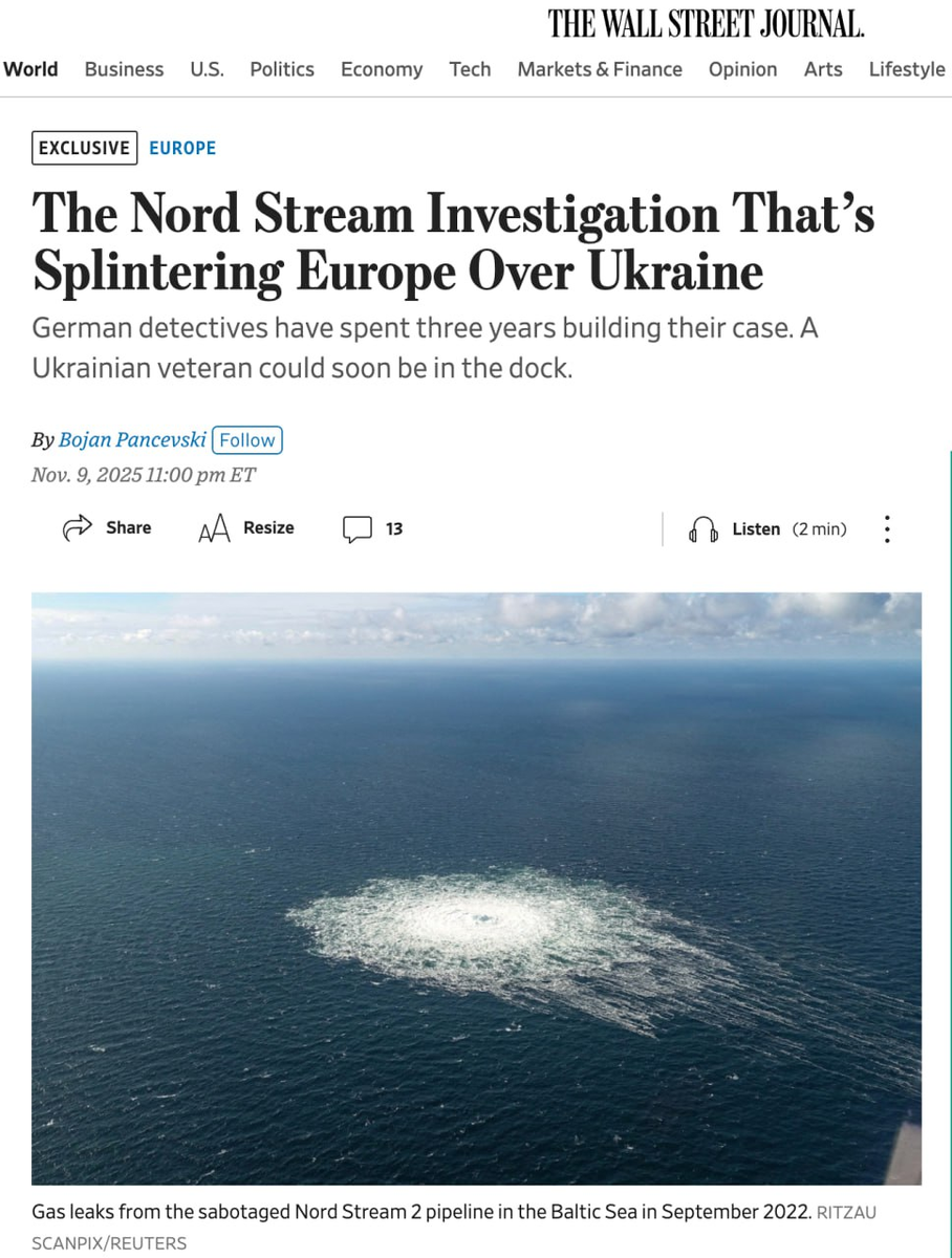 Немецкие следователи, если верить The Wall Street Journal, склоняются к той версии, которую все так старательно отрицали — Украина всё-таки причастна к подрыву газопроводов. Теперь любое судебное разбирательство грозит кризисом в отношениях между Берлином и Киевом.