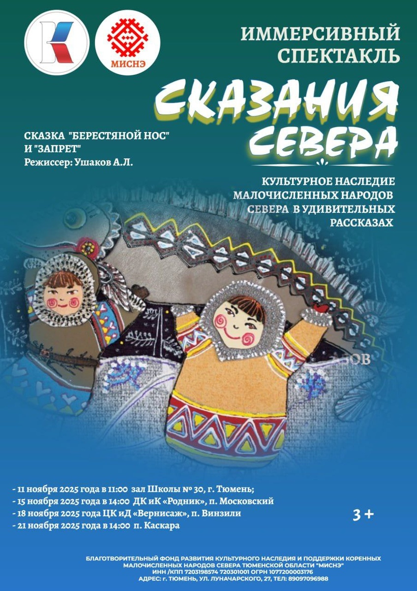 Иммерсивный спектакль «Сказания Севера»: ожившие сказки народов ханты и манси для всей семьи! Благотворительный фонд развития культурного наследия и поддержки коренных малочисленных народов Севера «Миснэ» при поддержке Президентского фонда культурных инициатив приглашает жителей Тюмени и Тюменской области на уникальный иммерсивный спектакль «Сказания Севера». В основе постановки — древние сказки коренных народов: хантыйская «Запрет» и мансийская «Берестяной нос». Спектакль адресован семьям с детьми от 3 до 11 лет и обещает настоящее театральное путешествие в удивительный и мудрый северный мир! Зрителей ждет оригинальное сочетание живой актерской игры и кукольного театра, наполненное яркими метафорами, северным колоритом, захватывающими сюжетами и запоминающимися героями. — «Запрет» — хантыйская история о брате и сестре, верности обычаям и умении ценить родовые традиции. —«Берестяной нос» — мансийская сказка о смелости, находчивости и встрече с загадочными духами леса. Погрузитесь