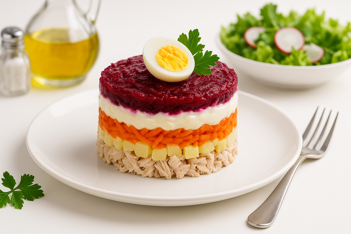 Представьте себе тот самый любимый вкус «шубы», только без селёдки. Сочные кусочки курицы, пропитанные нежным соусом, слоятся с тёплой свеклой, морковью и картофелем. Вкус знакомый, но новый - домашний, мягкий, праздничный. Калорийность на 100 г: 169 ккал Белки: 8,1 г Жиры: 10,3 г Углеводы: 11,6 г Ингредиенты (на форму Ø 20 см): Приготовление: Попробуйте этот вариант «шубы» хотя бы раз. Мягкая курица и сладость свёклы дают ту самую гармонию, ради которой потом долго ищешь ложку добавки. Сохраняйте рецепт и расскажите в комментариях, чем вы любите заменять селёдку в классических салатах.