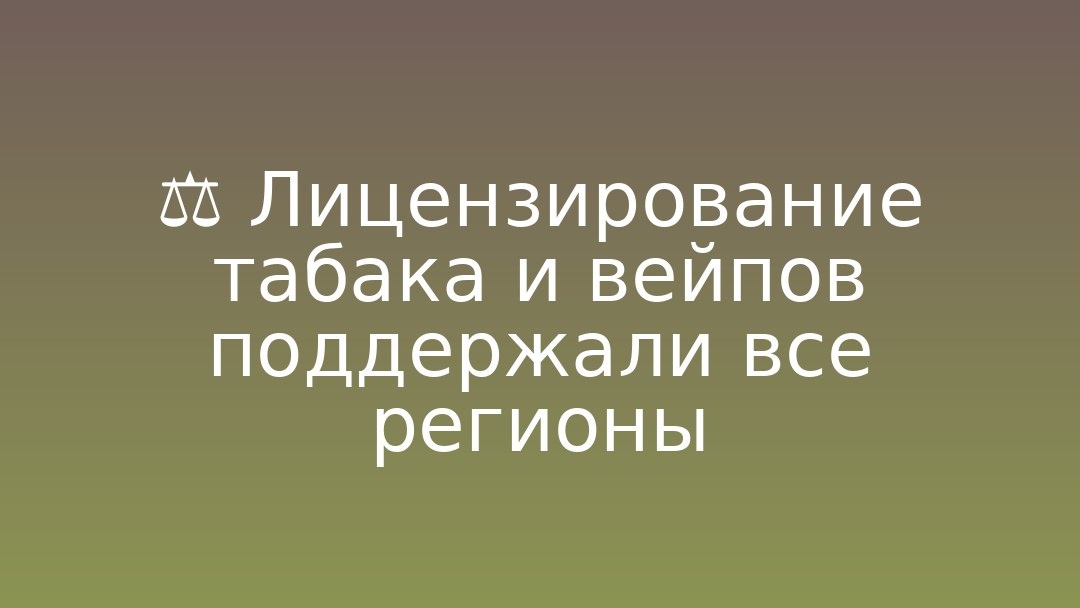 Правительство: все 89 субъектов РФ согласовали пакет законопроектов о лицензировании оборота табачной и никотинсодержащей продукции, включая электронные сигареты. Предлагается с 1 марта 2026 года разрешить продажу только при наличии лицензии. Цели — борьба с нелегальным рынком и ограничение доступа несовершеннолетних. Контроль в регионах планируется финансировать за счет госпошлин.