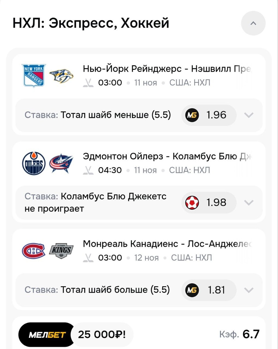 Ну и экспресс на ночь. В НХЛ традиционно много матчей, и мы решили помочь вам с выбором ставок 🏒 ✅ Рейнджерс-Нэшвилл Ставка: ТМ 5.5 шайб Тотал меньше 5.5 шайб сыграл в 7 из 8 последних домашних матчей команды Нью-Йорк Рейнджерс (НХЛ) ✅ Эдмонтон-Коламбус Ставка: Коламбус не проиграет Эдмонтон Ойлерз не побеждает в основное врем в 7 из 8 последних матчей (НХЛ) ✅ Монреаль-Лос-Анджелес Ставка: ТБ 5.5 шайб Тотал больше 5.5 шайб сыграл в 11 из 12 последних домашних матчей команды Монреаль Канадиенс Забери фрибет 🔝