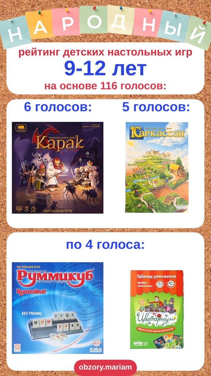 Народный рейтинг детских настольных игр на 9-12 лет 2025-2026, на основе 116 голосов: 1. Победитель с 6 голосами - «Приключения в замке Карак», ZVEZDA https://t.me/obzorymariam/1122. В прошлом году на этот возраст рейтинг я не делала, так что сравнивать не с чем) 2. 5 голосов у «Каркассона», HG https://t.me/obzorymariam/2344 3.4. По 4 голоса у: - «Руммикуб», Стиль Жизни https://t.me/obzorymariam/1277; - и, неожиданно, «Цветариум», Банда умников - видимо, действительно, школа так поглощает, что игра на изучение таблицы умножения актуальнее других👏🏻 5.6.7. И по 3 голоса у игр: - «Коварный волк», Стиль Жизни, https://t.me/obzorymariam/475; - «Калейдос», Стиль Жизни, https://t.me/obzorymariam/313; - «Ticket to Ride», HG https://t.me/obzorymariam/1256, здесь скорее всего больше всего голосов отдано за Европу (то есть 2 голоса🙈😅) и один за другую версию игры) obzory.mariam ✍🏻✅