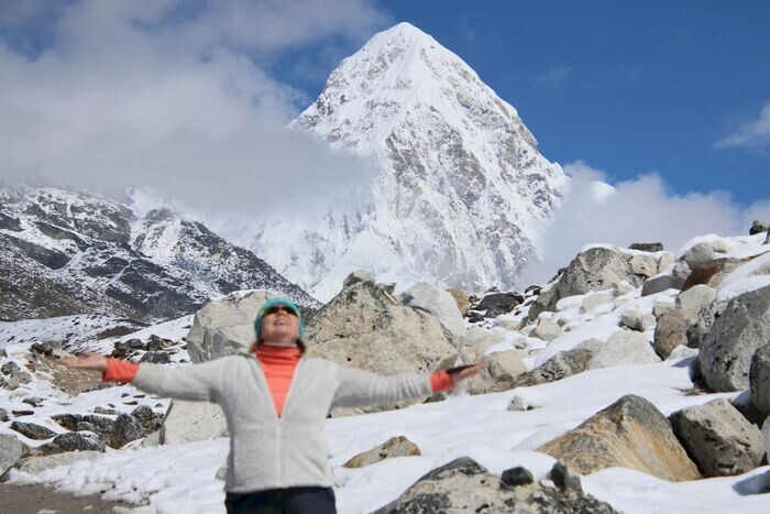 Так как мы впервой так высоко в горах, то решили, что это будет последний день нашего пути вперед, потом будем возвращаться. (да и по времени, уже и отпуск заканчивался). Так вот, бросив свои вещи в лодже, мы взяли теплых вещей и чай, двинулись к Лобуче, мапс ми показывал, что рядом с Лобуче есть место, откуда можно, в хорошую погоду, увидеть базовый лагерь Эвереста. И мы пошли, сначала по долине. Нам предстояло пройти около 18 км (в оба конца, погода была прекрасная, солнышко, немного облачков, но без солнцезащитных очков и балаклавы, никуда, спалишь себе все. Первым местом нашего перехода был Мемориал погибших альпинистов в Тукле. Даже с почти легким рюкзаком уже было не легко, перевал Тукла, это уже 5100 метров, дышать было гораздо тяжелее, но мы все равно это сделали и пошли дальше. в Лобуче. Там прилетали вертолеты, либо с лентяями, которые хотят просто долететь и вернутся (стоит где то от 500$ с носа, либо эвакуируют, кому стало плохо на высоте, таких тоже не мало. Дойдя до места