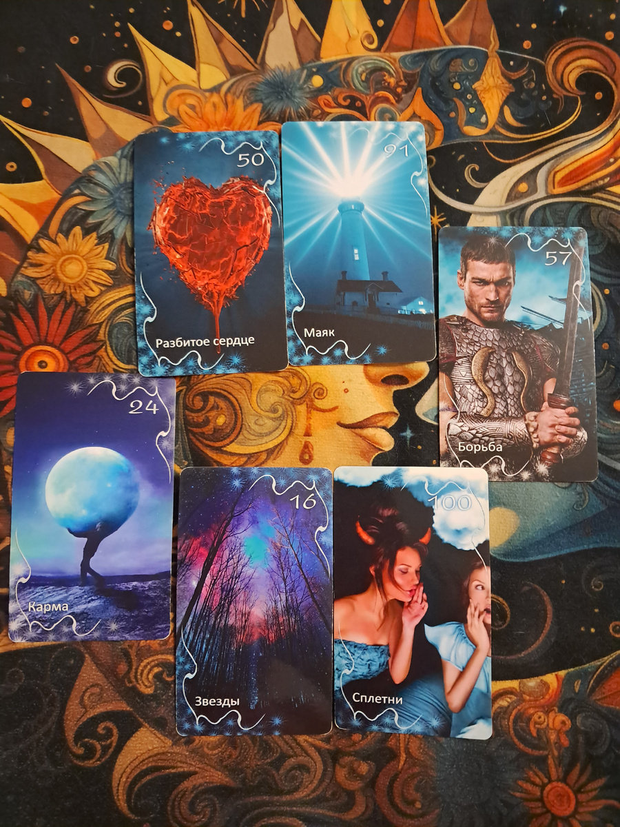 Сценарий такой: вы будете идти по жизни, исходя из своей старой боли (Разбитое сердце), игнорируя знаки и помощь (Маяк), что приведет к изматывающему конфликту (Борьба) и ухудшению репутации или отношений в обществе (Сплетни). В конце этого пути вас ждет озарение и понимание глубинных причин происходящего (Звезды), которое приведет к кармическому расплату и восстановлению справедливости (Карма).