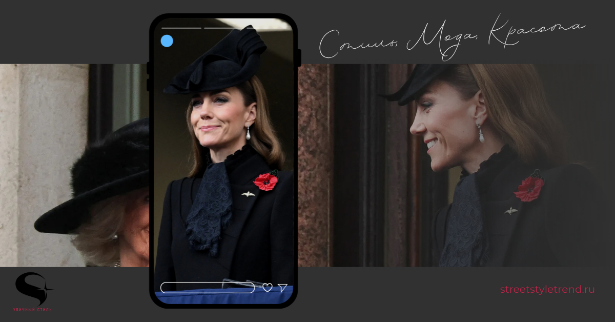 Принцесса Кейт вернулась к культовому образу с предыдущего Дня памяти, дополнив его новыми деталями. Этот день — не только день тихого общенационального размышления, но и исторический момент, в котором стиль принцессы проявляется наиболее ярко. Она была одета в идеально сшитое черное пальто Catherine Walker (последний раз его видели на церемонии прощания в 2022 году) с архитектурными лацканами в сочетании с темно-синей блузкой с кружевным воротником, подчеркивающим шею. Вместо широкополой шляпы, которую она надевала во время своего последнего выхода в свет, она надела новую скульптурную шляпу Lock & Co.