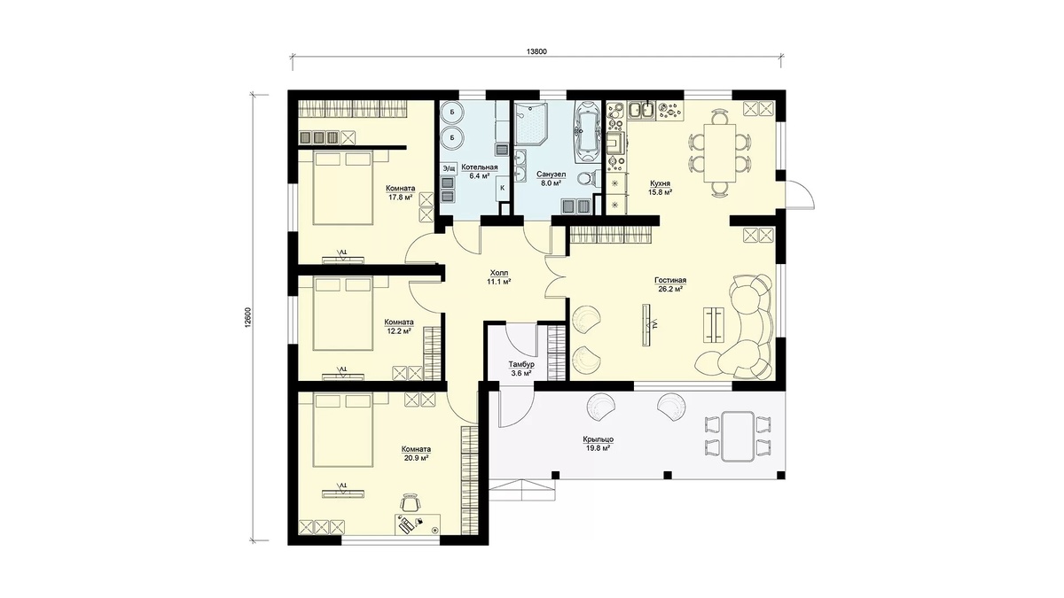 🏡 Представляем наш новый проект — Проект БП-142! Это одноэтажный загородный дом площадью 122 м² с большим крыльцом (20 м²), которое можно использовать как террасу для приятных вечеров и отдыха. Дом выполнен с двускатной крышей, что добавляет ему особого шарма и уюта. Планировка очень простая и практичная: с крыльца попадаем в тамбур, затем — в просторный холл. Из холла есть выход в три спальни, ванную комнату (8 м²), котельную, кухню (16 м²) и гостиную (26 м²). Одна из спален оборудована собственной гардеробной — для большего комфорта и удобства. Этот просторный и уютный дом идеально подойдет для семьи из 4-5 человек, желающей наслаждаться загородной жизнью в комфорте и гармонии. Узнайте больше о проекте: https://benpan.ru/project/bp-142-odnoehtazhnyj-zagorodnyj-dom/