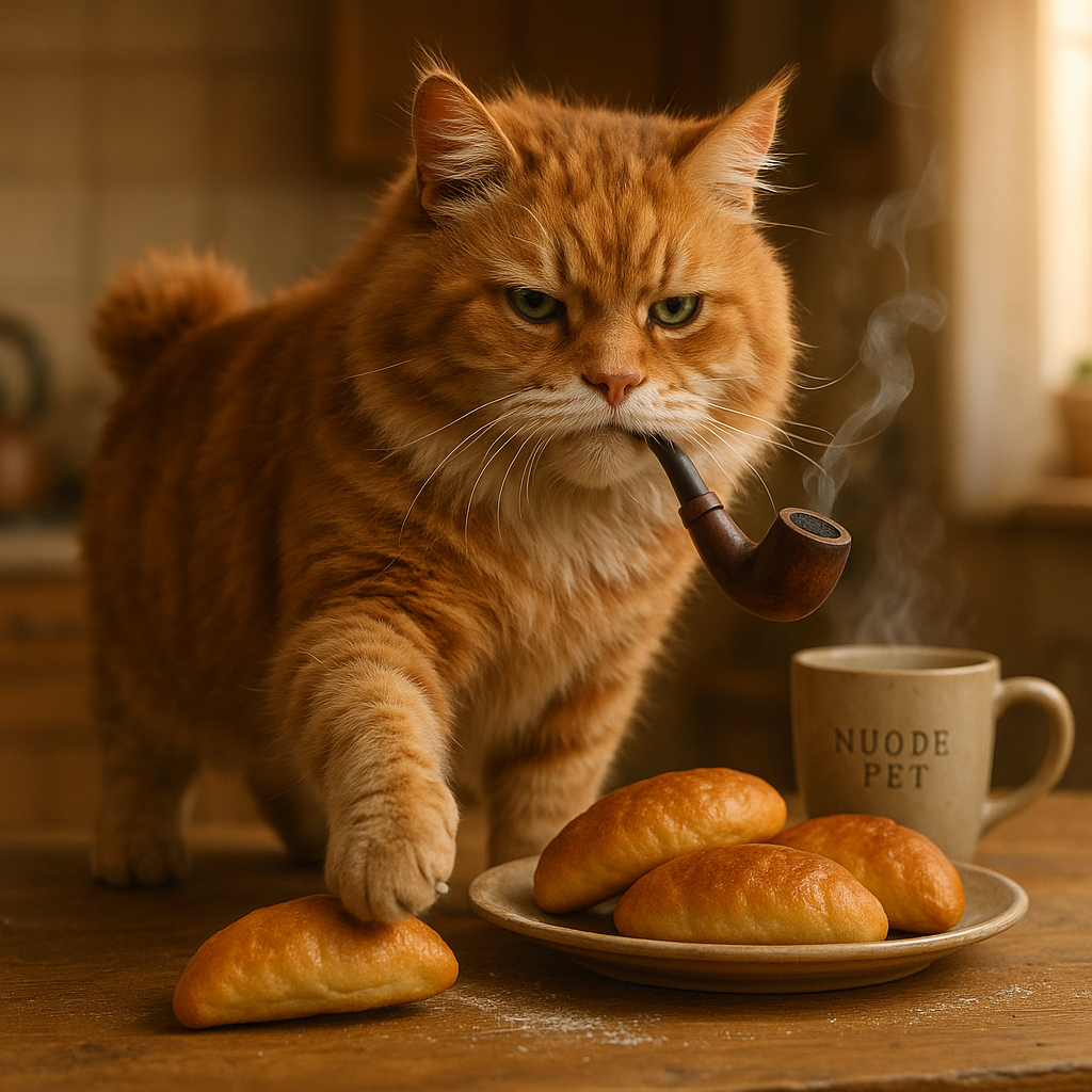 — Пирожки готовы! И вот тут воздух стал плотнее, чем шерсть на моём хвосте. Запах — божественный. Картошка, масло, чуть рыбки, всё идеально. В этот момент даже мои усы, обычно спокойные как старые мудрецы, приподнялись и насторожились. Я понял: судьба готовит испытание. Кожаные, как всегда, не ценят мгновение. Оставили тарелку с горячими пирожками прямо на столе — без присмотра! А один — особенно красивый. Золотистый, румяный, будто