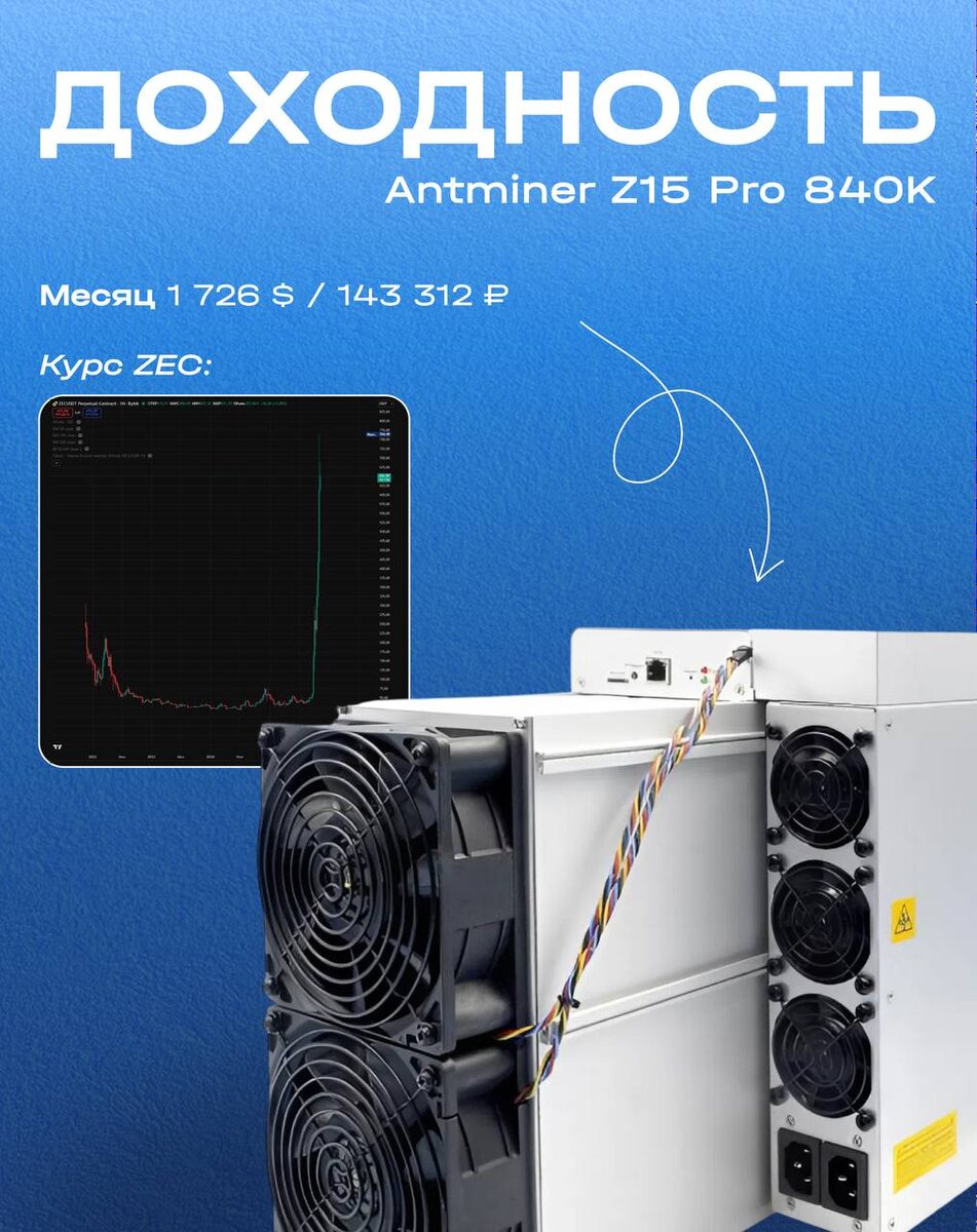 🔥 Доходность Antminer Z15 Pro На фоне роста Zcash это самый прибыльный ASIC на сегодняшний день. Майнит на алгоритме Equihash с хешрейтом 840 Kh/s, при энергопотреблении 3 024 Вт/час. Монеты: Zcash, Horizen, Pirate. ✔ Доходность на 10.11.2025 (тариф 5 ₽, по текущему курсу и сложности сети): Месяц 1 726 $ / 143 312 ₽ ➡️ Стоимость 4 024 USDT➕342 040 ₽ Сайт ➕ Отзывы ➕ Написать