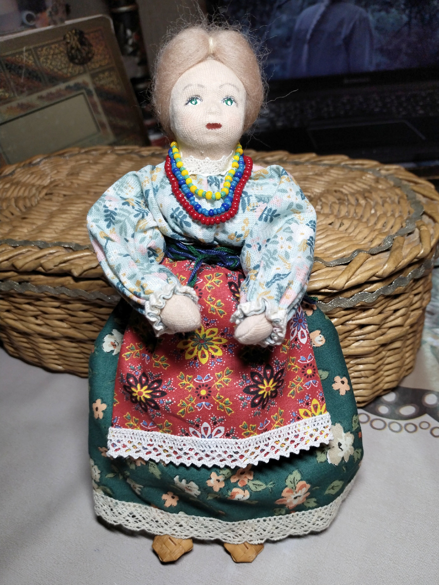 Вот именно в тот момент я и поняла, что мы с этой моей куклой - родня. Обратите внимание на расцветочку моей блузки и её рубахи. А? А-а!