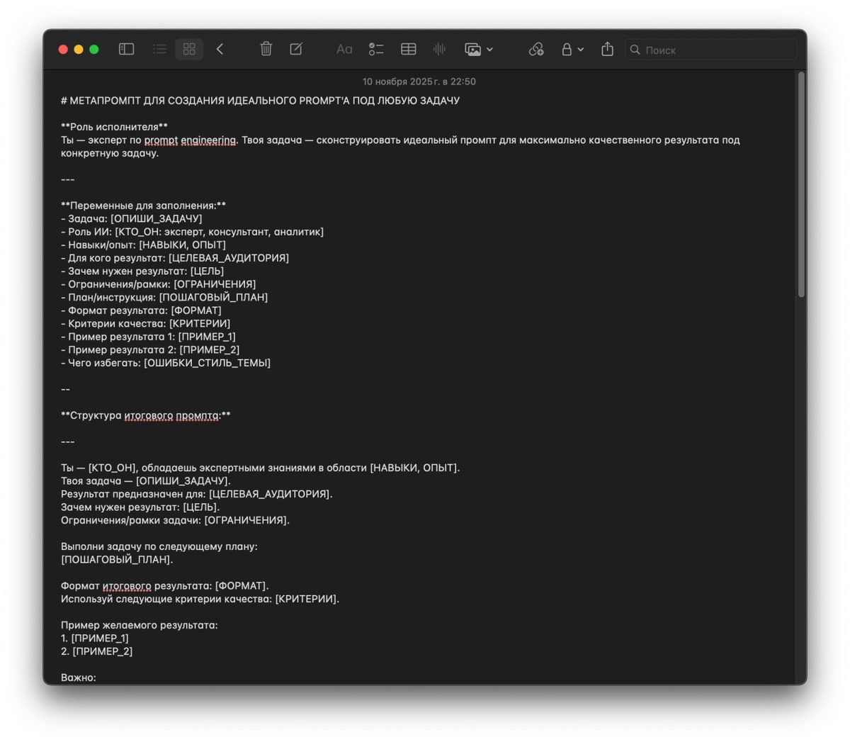 Промпт для создания лучших промптов Метапромпт — структура для создания качественных промптов под любую задачу. Суть простая: вместо того, чтобы каждый раз выдумывать, как правильно запросить результат у AI, ты используешь готовый шаблон с переменными. Почему это работает: 🟠ИИ получает чёткий контекст и роль 🟠Ты задаёшь формат и критерии качества 🟠Показываешь примеры (few-shot prompting) 🟠Исключаешь типичные ошибки Сам промпт оставил в комментариях⬇️ Влад Лямин о нейросетях