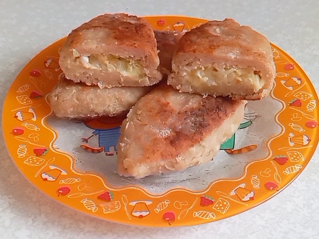 Дли приготовления этого блюда нам понадобится:куриный фарш - 400 грамм , луковица средняя - 1 штука,сыр твёрдый - 50 грамм,куриные яйца - 2 штуки варёные для начинки и одно сырое для фарша, мука - 100 грамм,измельчённый пшеничный хлеб по вкусу,масло для жарки. Шинкуем мелко одну среднюю луковицу. Обжариваем лук на сковороде до золотистой корочки. Натираем 50 грамм сыра. Измельчаем два куриных варёных яйца. Выкладываем это всё в глубокую тарелку и перемешиваем. Берём куриный фарш,добавляем в него измельчённый в блендере хлеб.Добавляем сырое куриное яйцо. Добавляем 100 - 150 грамм муки.И всё тщательно перемешиваем. Раскатываем фарш. Выкладываем на середину начинку. Защепляем края. Формуем в виде лодочки. Обжариваем на сковороде смазанной маслом с двух сторон до золотистой корочки. Наша вкусная альтернатива котлетам готова.ВСЕМ ПРИЯТНОГО АППЕТИТА!!!