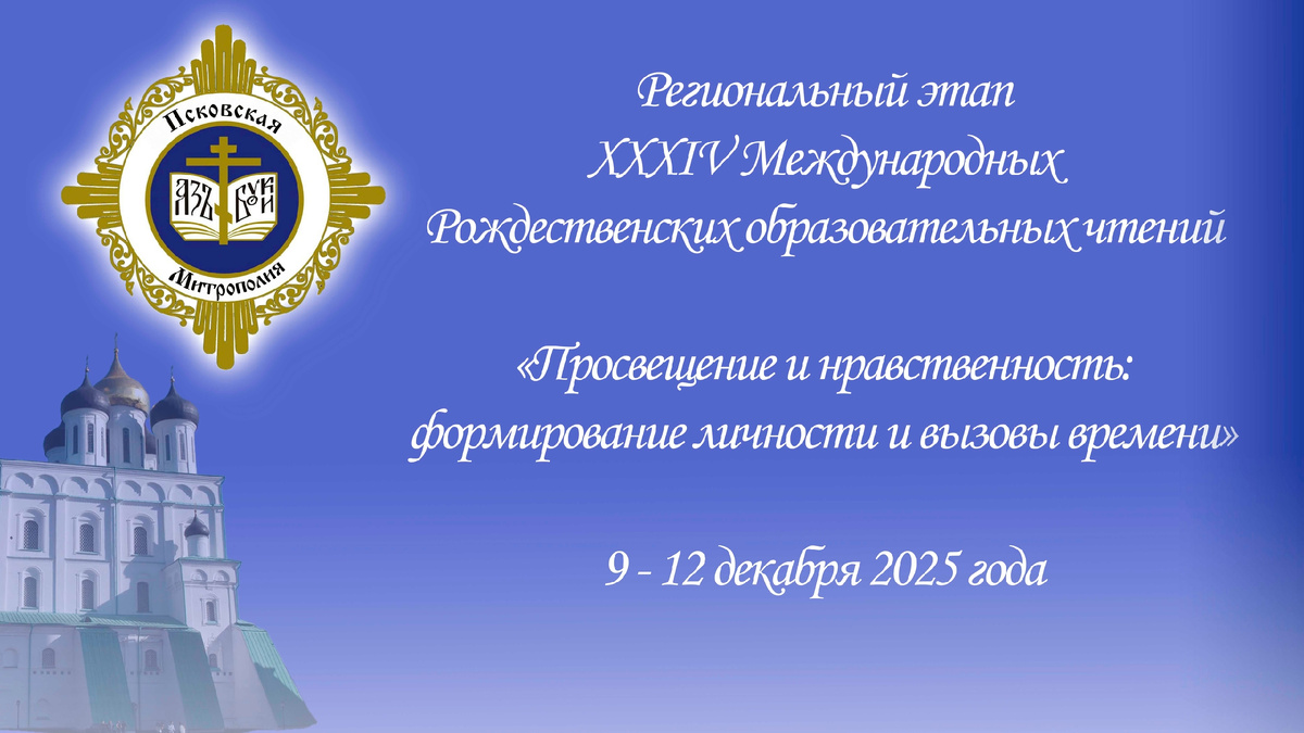 С 9 по 12 декабря в Псковской епархии пройдет Региональный этап XXXIV Международных Рождественских образовательных чтений «Просвещение и нравственность: формирование личности и вызовы времени». В рамках Чтений пройдут пленарное заседание, тематические секции и круглые столы, посвященные осмыслению церковно-общественного взаимодействия в решении актуальных вопросов современного общества, выработке единой стратегии в сфере образования, разработке и обсуждению методик, программ, концепций, стандартов и рекомендаций, способствующих духовно-нравственному развитию, а также обмену практическим опытом в вопросах воспитания и образования. К участию в образовательных чтениях в качестве слушателей и докладчиков приглашаются преподаватели, студенты, общественные деятели, а также все неравнодушные православные христиане. Чтобы стать участником Регионального этапа XXXIV Международных Рождественских образовательных чтений «Просвещение и нравственность: формирование личности и вызовы времени», необход