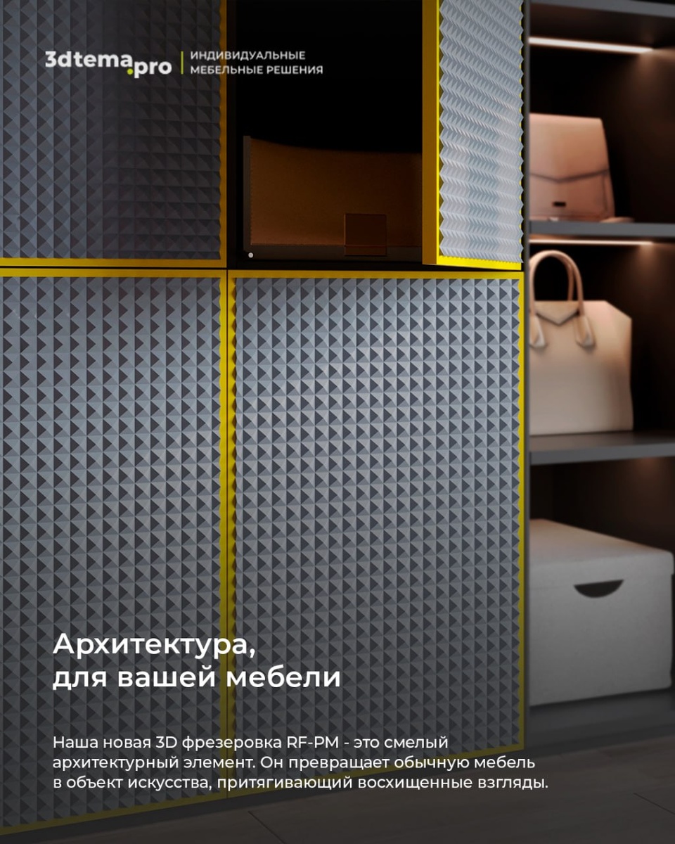 Объем, который меняет всё! ✨ Наша новая 3D фрезеровка RF-PM - это смелый архитектурный элемент. Он превращает обычную мебель в объект искусства, притягивающий восхищенные взгляды. Четкие выпуклые пирамиды создают неповторимую игру света и тени в течение всего дня. А строгая рамка глубиной 3 мм добавляет графичности и завершенности каждому элементу. Подарите мебели характер и роскошную тактильность. Выбирайте RF-PM, чтобы выйти за рамки плоского дизайна и создать пространство с эмоциями! 👉 Узнайте больше о фасаде на нашем сайте Всегда на связи для ваших проектов! Ответим на вопросы и поможем с выбором! 📱 Telegram 📱 WhatsApp 📱 Сайт: 3dtema.pro 📲 +7 495 278 08 44 ✉️ info@3dtema.ru
