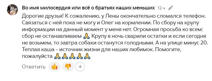 Здравствуйте, дорогие друзья! Утро сегодня не задалось. У Елены Николаевны окончательно сломался телефон и мне не удалось узнать у нее наши новости. Но Олег Николаевич прислал 2 утренних видео, которые я обработала и разместила для вас на этом канале. Написала о произошедшем в комментариях к видео и помчалась на работу. Уже по пути на работу я почуяла неладное. И не зря. Мой комментарий стал невидимкой и вижу его только я. Вот такие бывают у нас сюрпризы от дзенушки. В итоге, сборов сегодня практически не было. Вчера нам удалось собрать на вожделенную крупу 34 000 рублей. Вместе с нами на своем канале в ВК Наталья Владимировна просила помощи на крупу у своих подписчиков. Ей удалось собрать 18 000 рублей. В общей сложности получилось 52 000 рублей, которые были переведены нашему крупяному поставщику. Но в этот раз наш поставщик посчитал не достаточной переведенную сумму и настоятельно попросил перевести еще 13 000 рублей. Хадича на сайте отлова ЦАСС увидела фото маленькой, худенькой соб