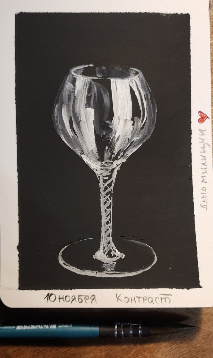 В ответ на пост 🎨 День 10: Контраст, который зазвучал! Сегодняшняя тема «Контраст» нашла своё воплощение в хрустальной чистоте и бархатной темноте. Нарисовала хрустальный бокал на чёрном фоне белой гуашью. Получилась история о свете, который рождается из тьмы, о хрупкости и силе одновременно. Бокал будто бы звенит в тишине — вот что делает контраст! А ещё сегодня — День сотрудников органов внутренних дел (или, как многие привыкли с детства, День милиции). Я когда-то работала в этой системе и хорошо знаю, что стоит за формой. Это труд, который требует огромной выдержки, мужества и, подчас, настоящего самопожертвования. От всей души хочу поздравить всех причастных — действующих сотрудников и ветеранов! Здоровья вам, выдержки, благополучия вашим семьям и спокойных дежурств. Вы — тот самый контрастный свет, который стоит между нами и тьмой. Спасибо за ваш труд! 💙 А вы как видите контраст? Делитесь работами! #день10 #челлендж #темаконтраст #хрустальныйбокал #деньмвд #деньмилиции #поз