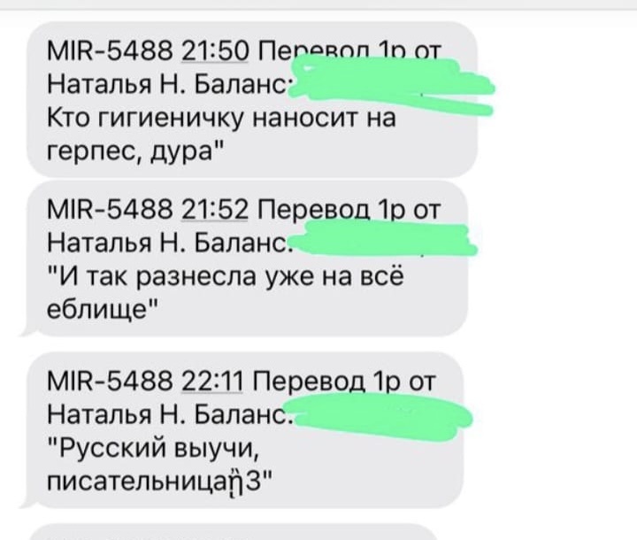 О тебе никто не вспоминает! Ну-ка ответь, я хоть раз выставляла фото твоих родственников с унижениями и оскорблениями? Ты по моей семье прошлась катком! И у меня все скрины есть! Забыла свои перечисления мне по рублю? Напоминаю! Слог улавливаете, это разве не оскорбление? Так, кто кого травит? Кто тебе позволил у себя на странице выставлять фото мои личные? А тут ты, вообще клеветой занимаешься, у себя на странице, с моей фотографией и с фото моей подруги! Никогда не писала о твоих детях, да и о тебе! У тебя есть доказательства, или домыслы только? Говоришь «бумеранг»? Ты мне про бумеранг тоже писала два года назад, когда я под капельницами лежала , а ты вдруг решила, что какой- то аккаунт пишущий тебе неприятные вещи, это я. Хватит писать про меня гадости , если доказательств нет! А кто три года назад впервые появился на моём аккаунте с оскорблениями? Забыла? Значит, это не бумеранг — я только напоминаю тебе, когда в своих статьях ты упоминаешь меня и моих