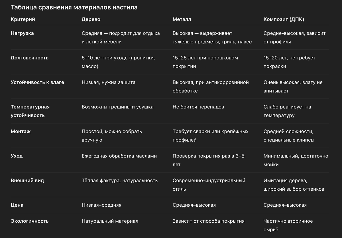 Комбинируйте материалы — металлический каркас и композитный настил дают оптимальный баланс прочности и уюта.