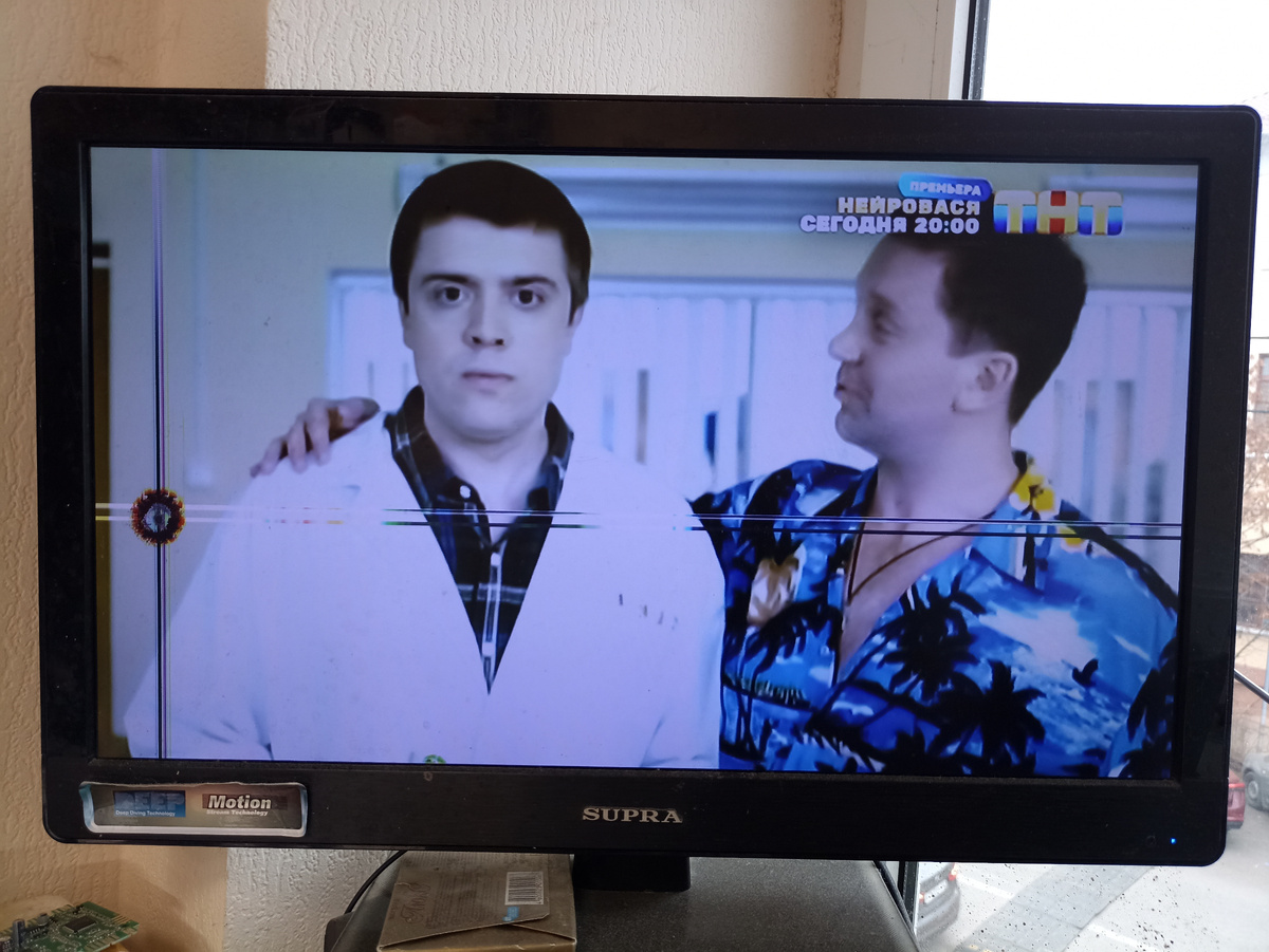 Всем здравствуйте! Сегодня статья не про ремонт, а про то как я поломал свою аппаратуру, при ремонте одного устройства. К сожалению статьи по ремонту самого аппарата не будет, ибо в этот день я дома забыл свой телефон, и слава Богу, а то могла случиться и ещё одна беда. Итак первое повреждение смотрим на экране телевизора, который у меня всегда ТНТ-у гоняет на работе. Видите точку на экране и от неё пошли полосочки? Вот и я увидел, но не сразу!