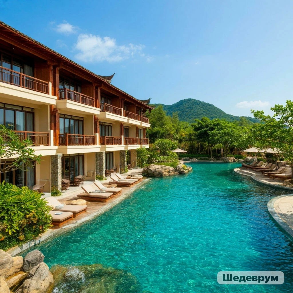 Друзья, всем привет! Продолжаем наше путешествие по острову Хайнань. Четыре дня пролетели не заметно. Переезд и новая остановка: бухта Ялунвань (Ялонг Бей), Мы заказываем такси через отельного гида, грузим вещи в такси и вот начинается наш переезд. По мере удаления от Дадунхая пейзаж за окном меняется: шумные улицы сменяются широкими проспектами, застроенными роскошными жилыми комплексами и полями для гольфа. Воздух кажется еще чище, а небо — просторнее. Наш отель в Ялунване: это Mangrov Tree 5 * Подъезжая к отелю, мы сразу понимаем — здесь все иначе. Это не высотка, а, скорее, просторный курортный комплекс, раскинувшийся на огромной территории среди тропических садов. Архитектура низкоэтажная-5-6 этажей, вдохновленная традиционными азиатскими мотивами. Нас встречают улыбчивые портье, предлагают прохладный напиток и ароматное полотенце. Наш номер — это просторное убежище с огромной кроватью, отдельной ванной и террасой, выходящей в сад. В номере есть всё необходимое: тап