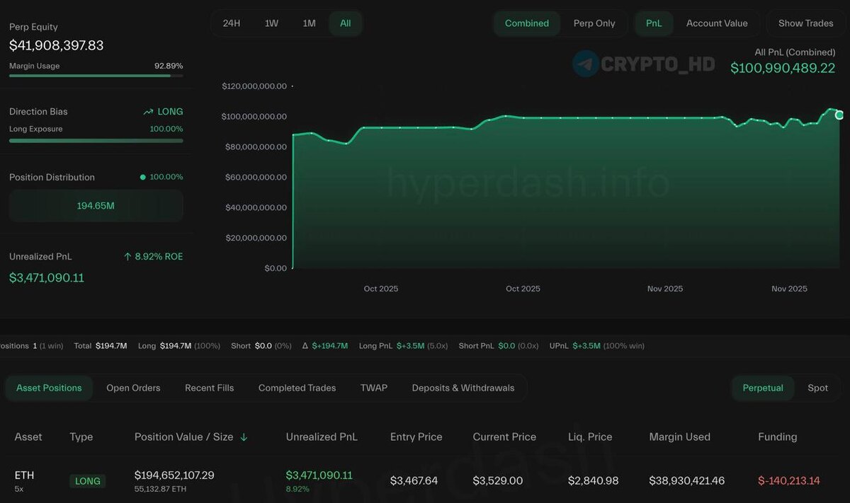🤨 Инсайдер Bitcoin OG увеличил свой лонг по #ETH с 5х плечом уже до $194,000,000