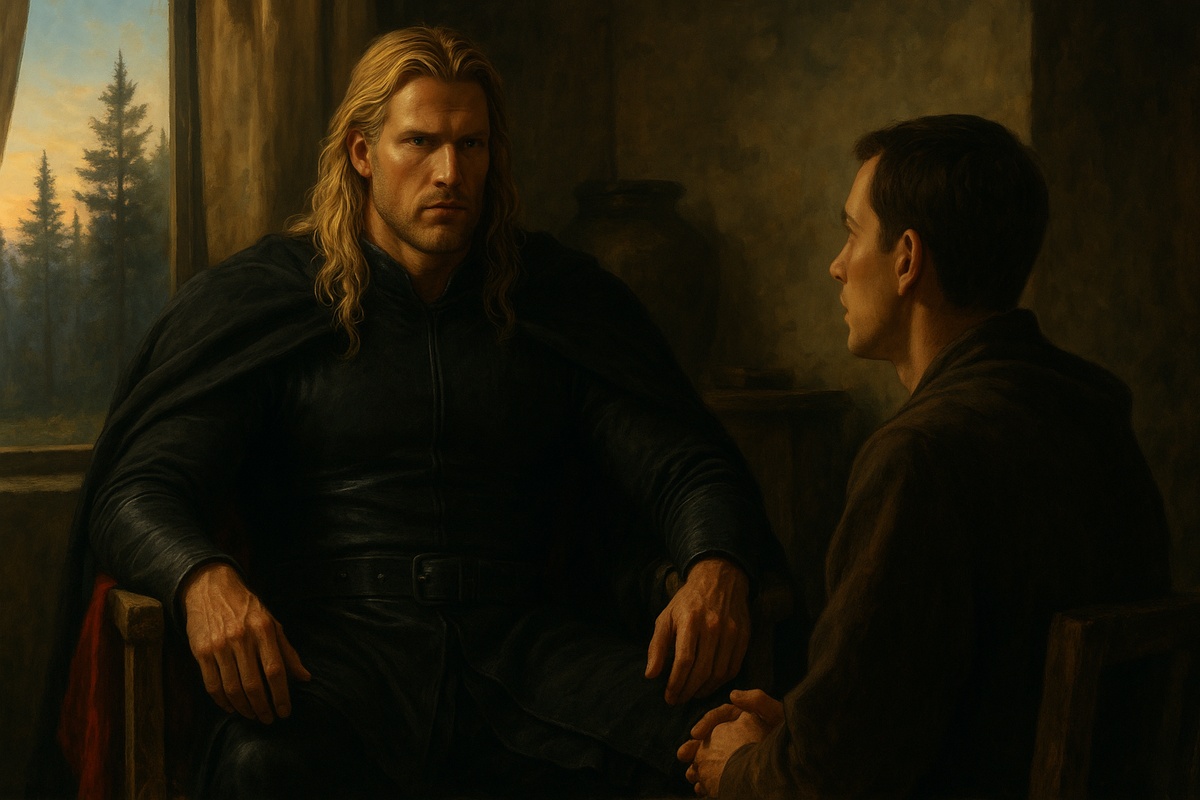 Тем временем рассвет забрезжил в верхушках соснового леса перед его окном, и появился тот, кого он ждал всегда. Рыцарь был одет в черный плащ, накинутый поверх такого же черного средневекового костюма. А обут он был в высокие кожаные сапоги, тоже иссиня-черные. Поприветствовав Вестника, он расположился в своем излюбленном кресле и без долгих предисловий начал: